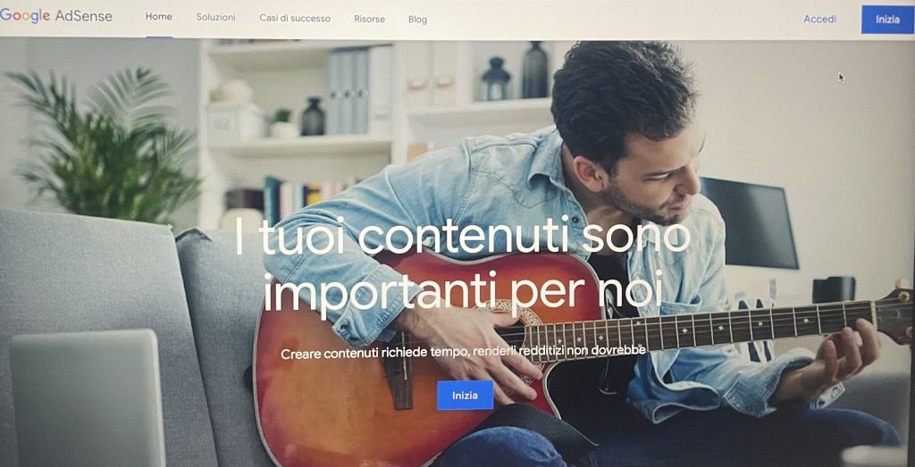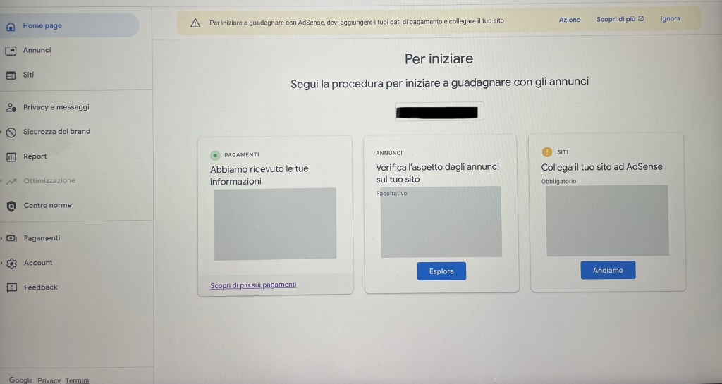 • Vai su Google AdSense e clicca su “Inizia”. Dovrai inserire i tuoi dati personali, il sito web e collegare un account Google.